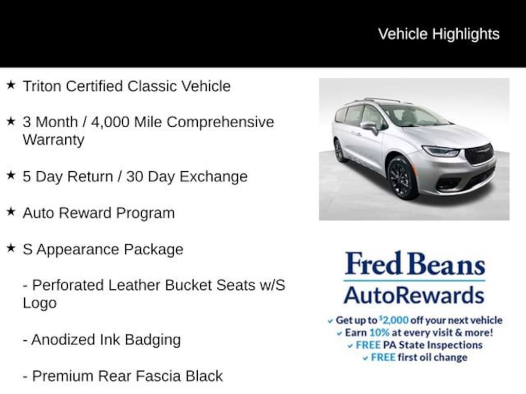 This Pacifica is a Triton Certified Classic Vehicle, meaning it has undergone a comprehensive inspection and comes with a 3-month/4,000-mile comprehensive warranty, as well as a 5-day return/30-day exchange policy. You can drive with confidence, knowing this Pacifica has been meticulously cared for and is ready to provide you and your family with years of reliable and enjoyable transportation.