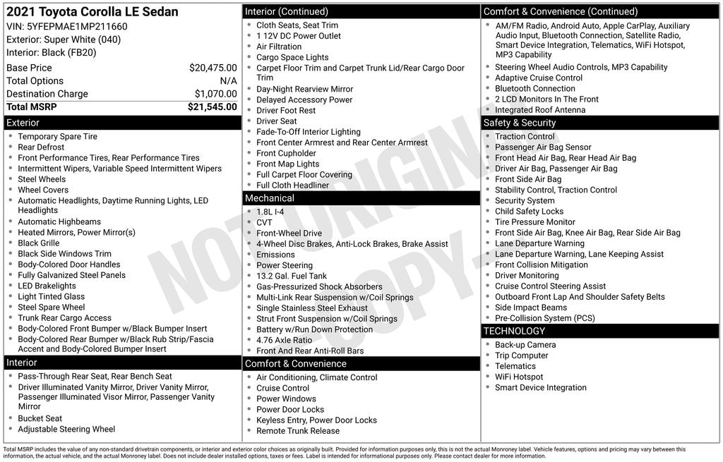 2021 Toyota Corolla LE 1.8L I4 DOHC 16V CVT FWD 4D Sedan Super White 30/38 City/Highway MPG 30/38 City/Highway MPG Visit our Website for a Complimentary CarFax Report!!!, Auto Reward Program, 4-Wheel Disc Brakes, 6 Speakers, ABS brakes, Air Conditioning, AM/FM radio: SiriusXM, Apple CarPlay/Android Auto, Auto High-beam Headlights, Automatic temperature control, Brake assist, Bumpers: body-color, Delay-off headlights, Driver door bin, Driver vanity mirror, Dual front impact airbags, Dual front side impact airbags, Electronic Stability Control, Emergency communication system: Safety Connect with 1-year trial, Exterior Parking Camera Rear, Four wheel independent suspension, Front anti-roll bar, Front Bucket Seats, Front Center Armrest, Front reading lights, Fully automatic headlights, Illuminated entry, Knee airbag, Low tire pressure warning, Occupant sensing airbag, Outside temperature display, Overhead airbag, Panic alarm, Passenger door bin, Passenger vanity mirror, Power door mirrors, Power steering, Power windows, Premium Fabric Seat Trim, Radio data system, Radio: Audio, Rear anti-roll bar, Rear seat center armrest, Rear side impact airbag, Rear window defroster, Remote keyless entry, Security system, Speed control, Split folding rear seat, Steering wheel mounted audio controls, Tachometer, Telescoping steering wheel, Tilt steering wheel, Traction control, Trip computer, Variably intermittent wipers, Wheels: 16" Wide Vent Steel.